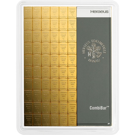Heraeus Combi guldbarre 100 x 1g med en renhed på 999,9promille (99,99%) fra Tyskland.