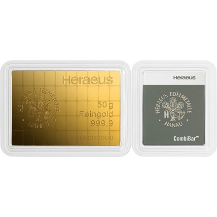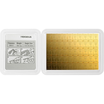 Heraeus Combi guldbarre 50 x 1g med en renhed på 999,9promille (99,99%) fra Tyskland.