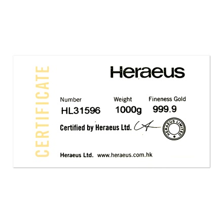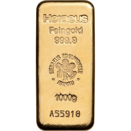 Heraeus guldbarre på 1000g med en renhed på 999,9promille (99,99%) fra Tyskland.