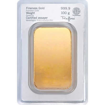 Heraeus guldbarre på 100g med en renhed på 999,9promille (99,99%) fra Tyskland.