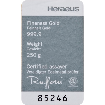 Heraeus guldbarre på 250g med en renhed på 999,9promille (99,99%) fra Tyskland.