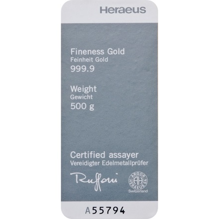 Heraeus guldbarre på 500g med en renhed på 999,9promille (99,99%) fra Tyskland.