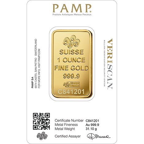 Pamp guldbarre 1oz med en renhed på 999,9promille (99,99%)