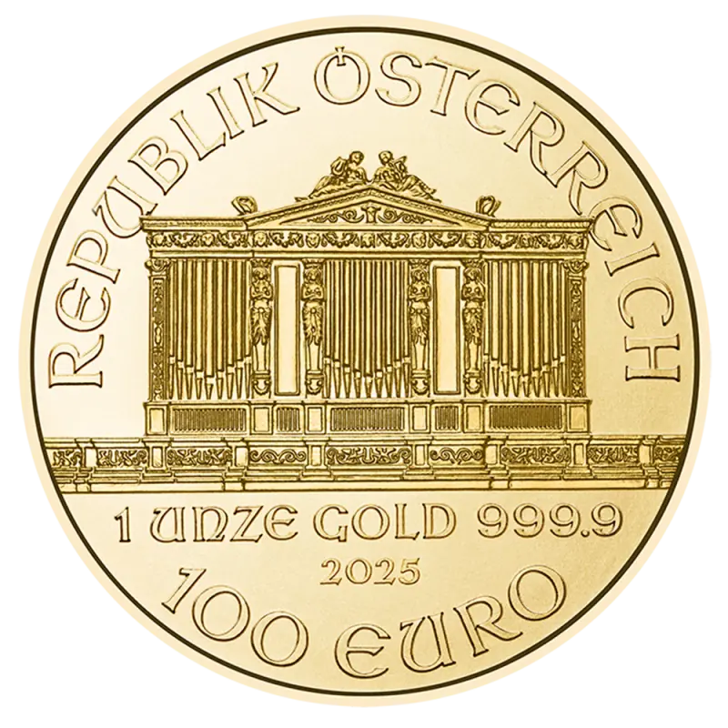 Philharmonik 1oz guldmønt 2025 med en finhed på 999,9.
