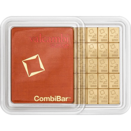 Valcambi Combi Gulbarre med 50 x 1g med en renhed på 999,9promille (99,99%) fra Schweiz.