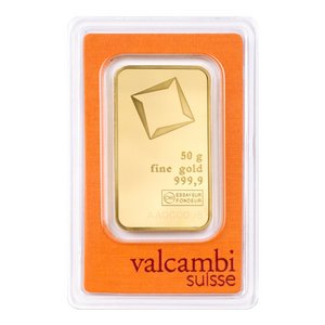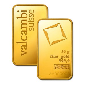 Valcambi gulbarre på 50g med en renhed på 999,9promille (99,99%) fra Schweiz.