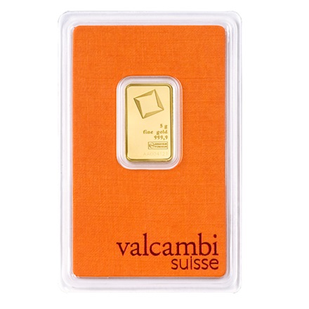 Valcambi gulbarre på 5g med en renhed på 999,9promille (99,99%) fra Schweiz.